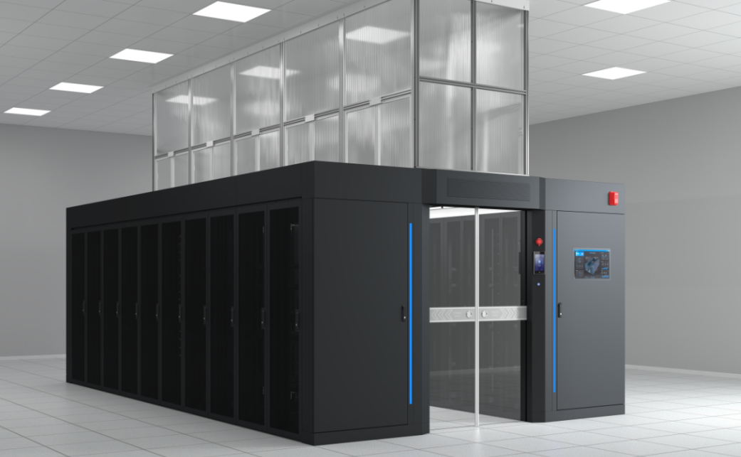 Micro-módulo con pasillo caliente cerrado, con un ancho interno claro típico de 1800 mm. Los componentes del pasillo cerrado incluyen: