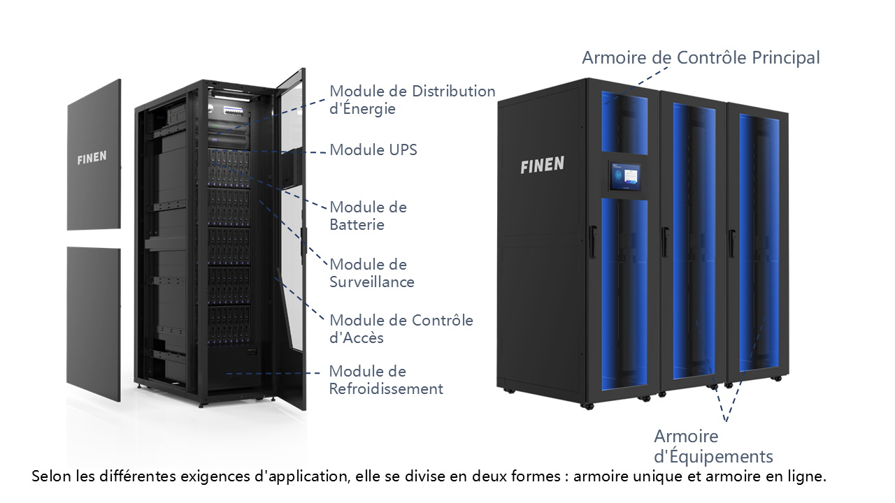 - Intègre les sous-systèmes : armoires, refroidissement, alimentation, câblage, sécurité incendie, ventilation, mise à la terre, éclairage, surveillance, offrant une solution complète