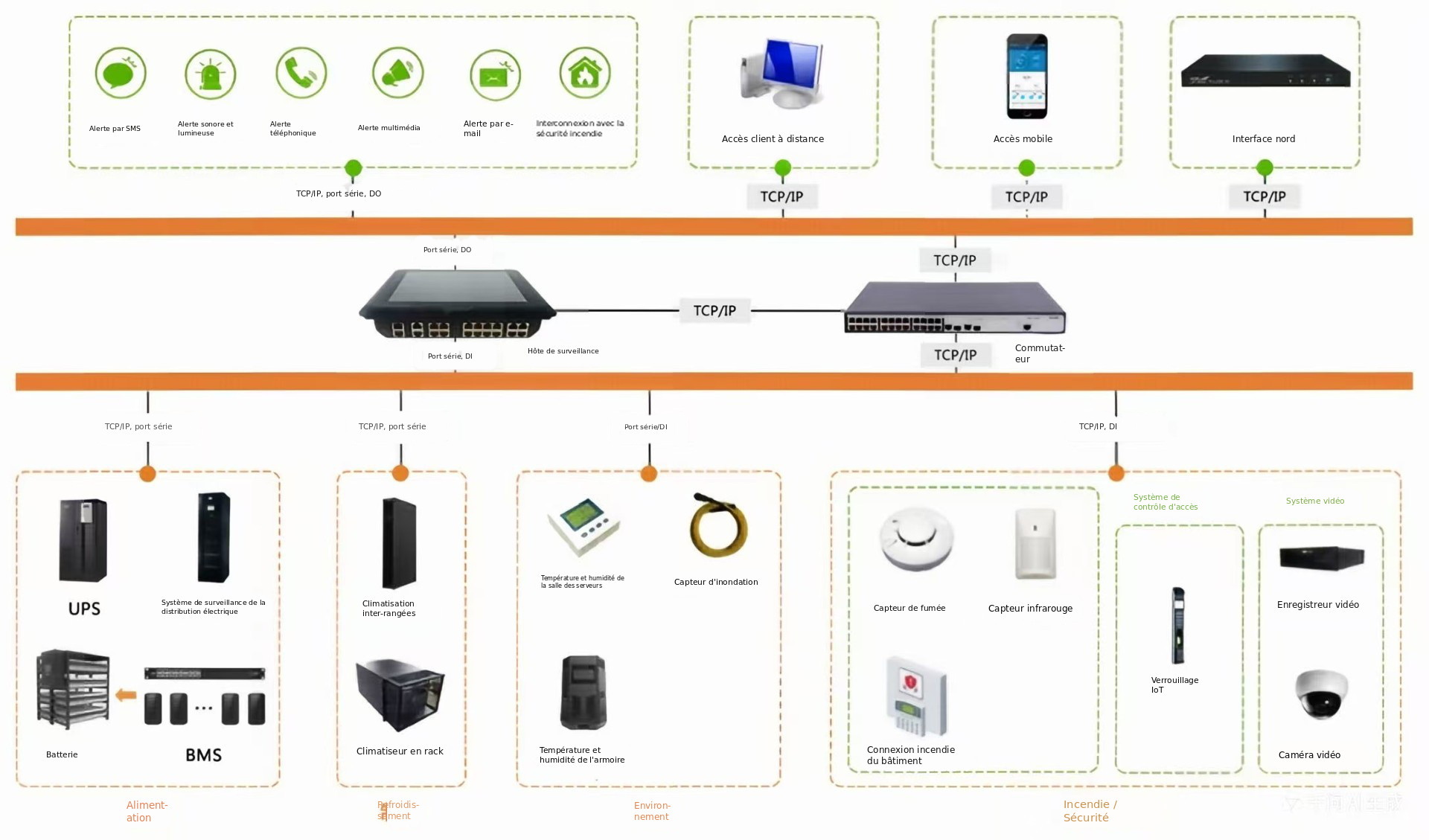 | Système de surveillance | Fonctions de surveillance | Écran tactile 10,1 pouces, surveille la distribution électrique, UPS, batteries, température/humidité, fumée, fuite d’eau, contrôle d’accès, etc. ; gestion des données en temps réel et historiques | |