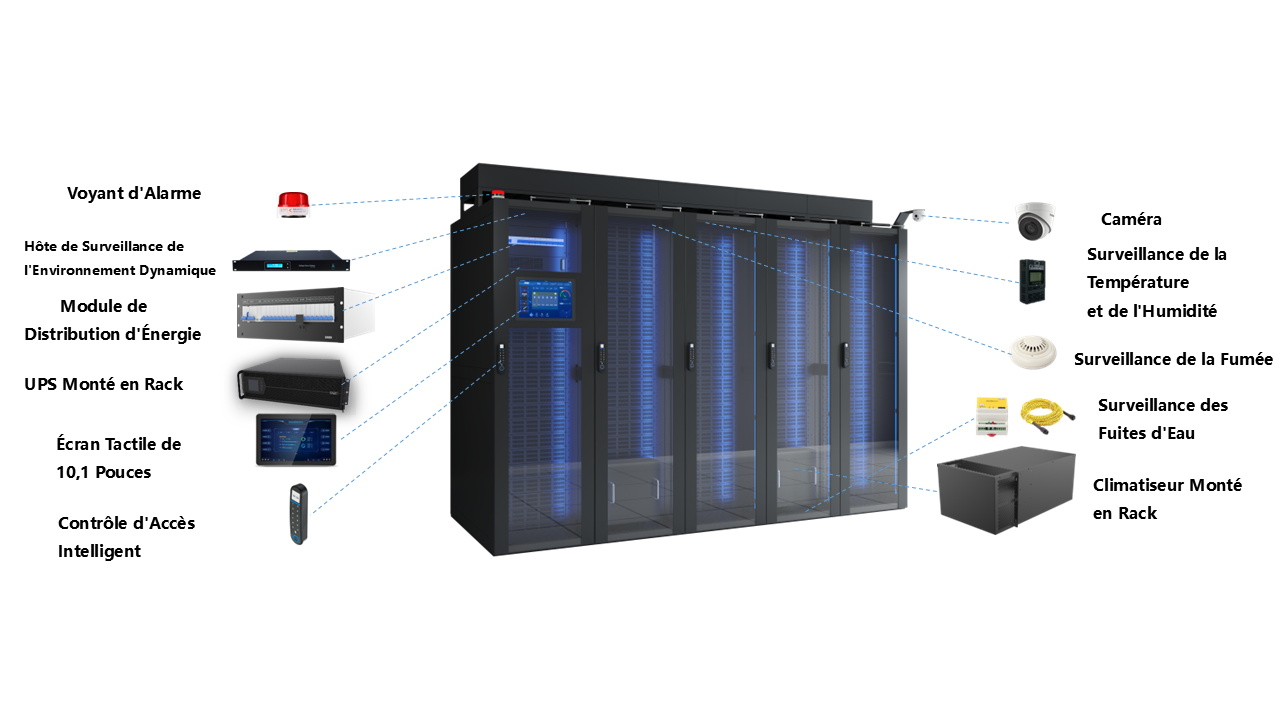 Intègre les systèmes de distribution électrique, UPS, surveillance, refroidissement, baies et sécurité. Prend en charge l’extension rapide et la gestion intelligente, réduisant la complexité de maintenance.