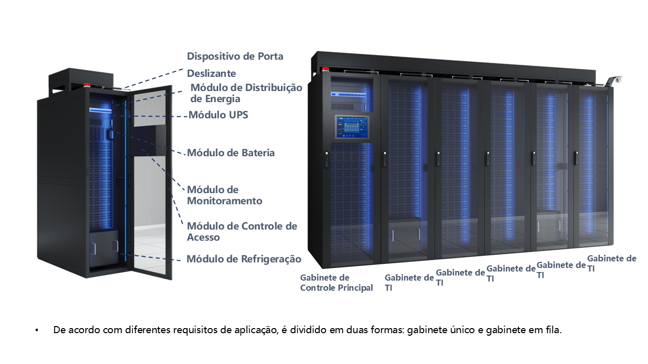 Solução de data center modular compacto para computação de borda e filiais. Por meio de um design altamente integrado, integra os sistemas de distribuição de energia, UPS, monitoramento, refrigeração, gabinetes, extinção de incêndio (opcional) e segurança em um único sistema, economizando significativamente espaço. Pré-fabricado na fábrica, plug-and-play, possibilita implantação rápida e manutenção remota.